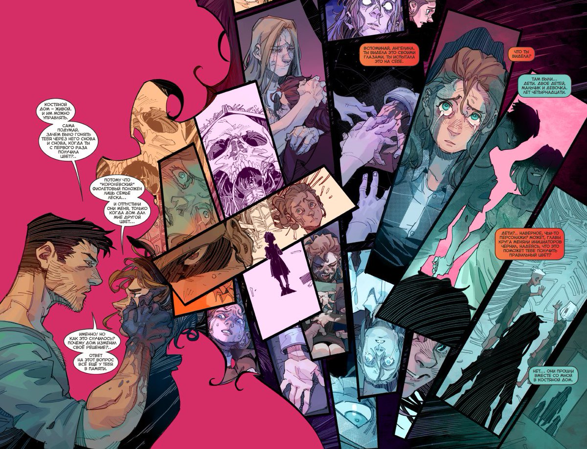 Как по мне, это главное золото «Экслибриума». Анна Каренина, совершающая попытку самоубийства в метро, Красная шапочка, несущая макаруны своей бабушке — все это даже звучит неординарно. Крокодил, проглотивший Солнце, уже не кажется таким детским, а наоборот, становится реальной угрозой наподобие легендарного Кайдзю. Даже гроб на колесиках в мире комикса снова способен заинтересовать читателя. Фантазии Натальи Девовой явно не занимать. Еще интереснее путешествия героев комикса внутрь книг: город из «Тени над Иннсмутом» Говарда Лавкрафта выглядит как на экране. Эти отсылки и обыгрывания дают сюжету «Экслибриума» возможность создания нестандартных испытаний для героев, а сам комикс на фоне упоминаемых книг выглядит как тот самый друг, что был всегда рядом, но никто не может вспомнить его имя.