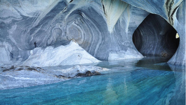 Эти поразительные пещеры, украшающие берега озера Хенераль-Каррера, словно созданы искусным мастером. Замысловатые лабиринты из мрамора играют оттенками фиолетового, голубого и бирюзового – это танец света, отражённого в бирюзовой воде озера. Всё это – результат тысячелетней работы волн, отполировавших горную породу до зеркального блеска. Ощущение – словно находишься внутри гигантской перламутровой раковины.